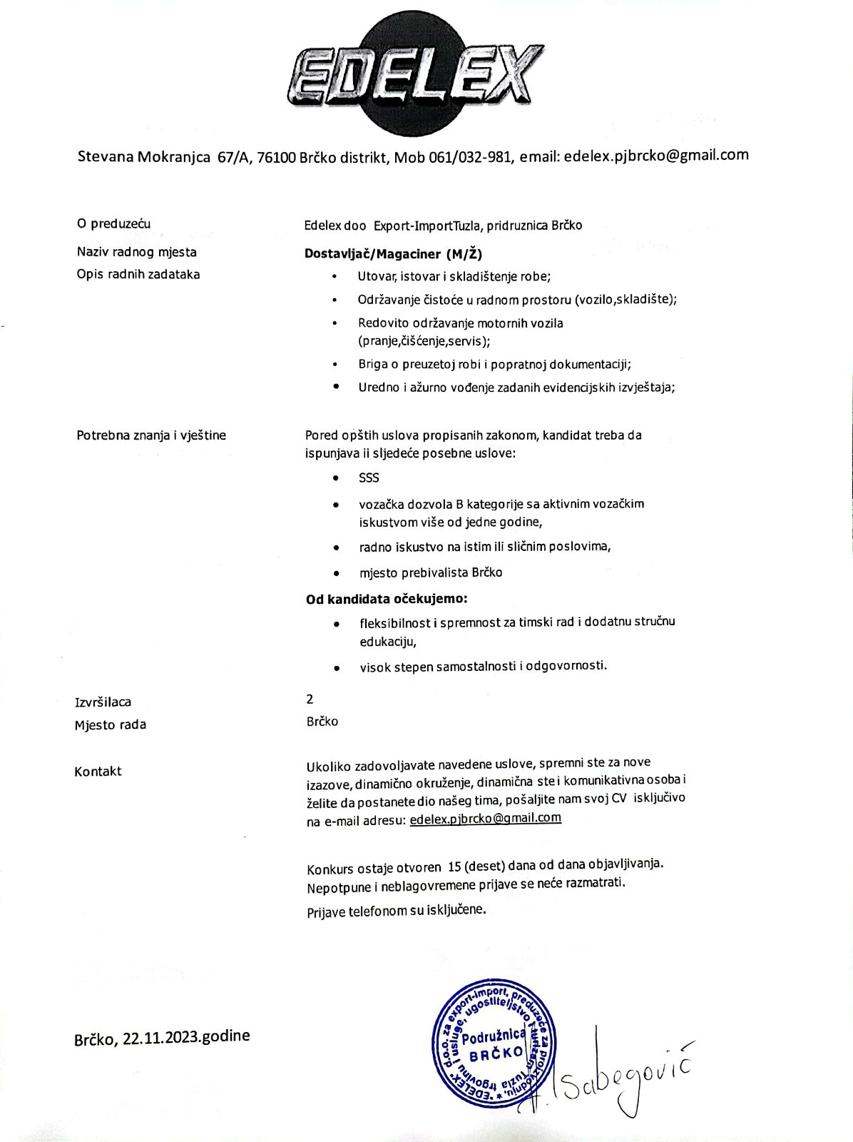Poslovi 21 Nov,2023 Štampa Poslovi Dostavljač/magacioner Dostavljač/magacioner (2)Edelex d.o.o.Brčko Prethodno Sljedeće