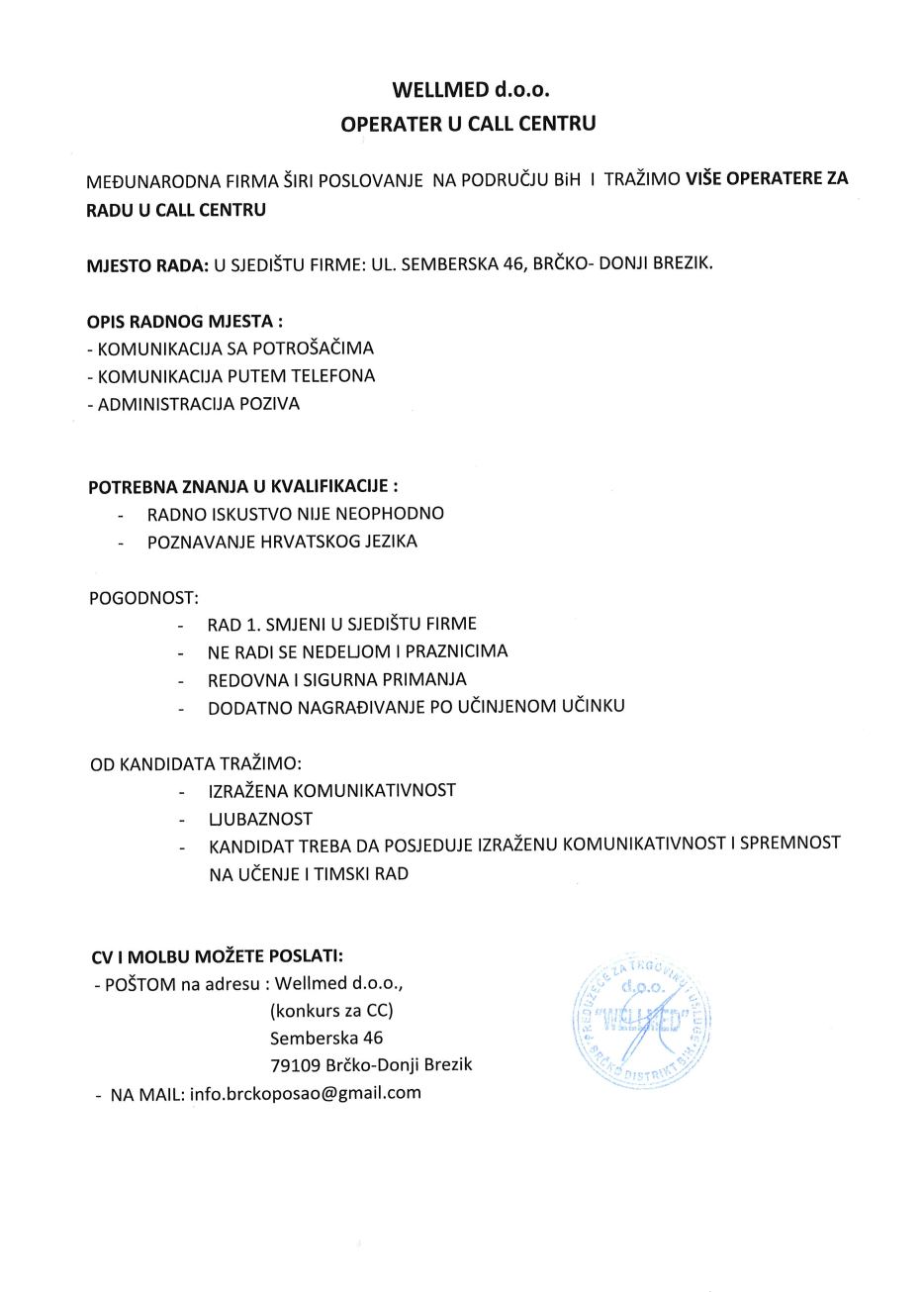 Poslovi 04 Apr,2024 Štampa Poslovi Operater u call centru Operater u call centru (1)Wellmed dooD Brezik, Brčko Prethodno Sljedeće