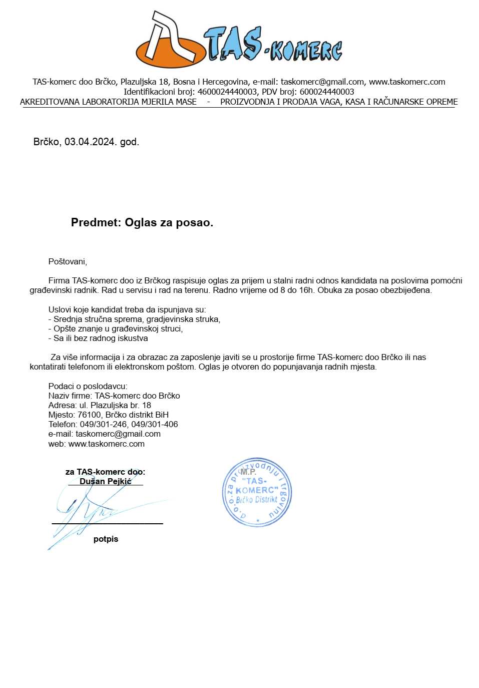Poslovi 04 Apr,2024 Štampa Poslovi Pomoćni građevinski radnik Pomoćni građevinski radnik (1)TAS komerc dooBrčko Prethodno Sljedeće