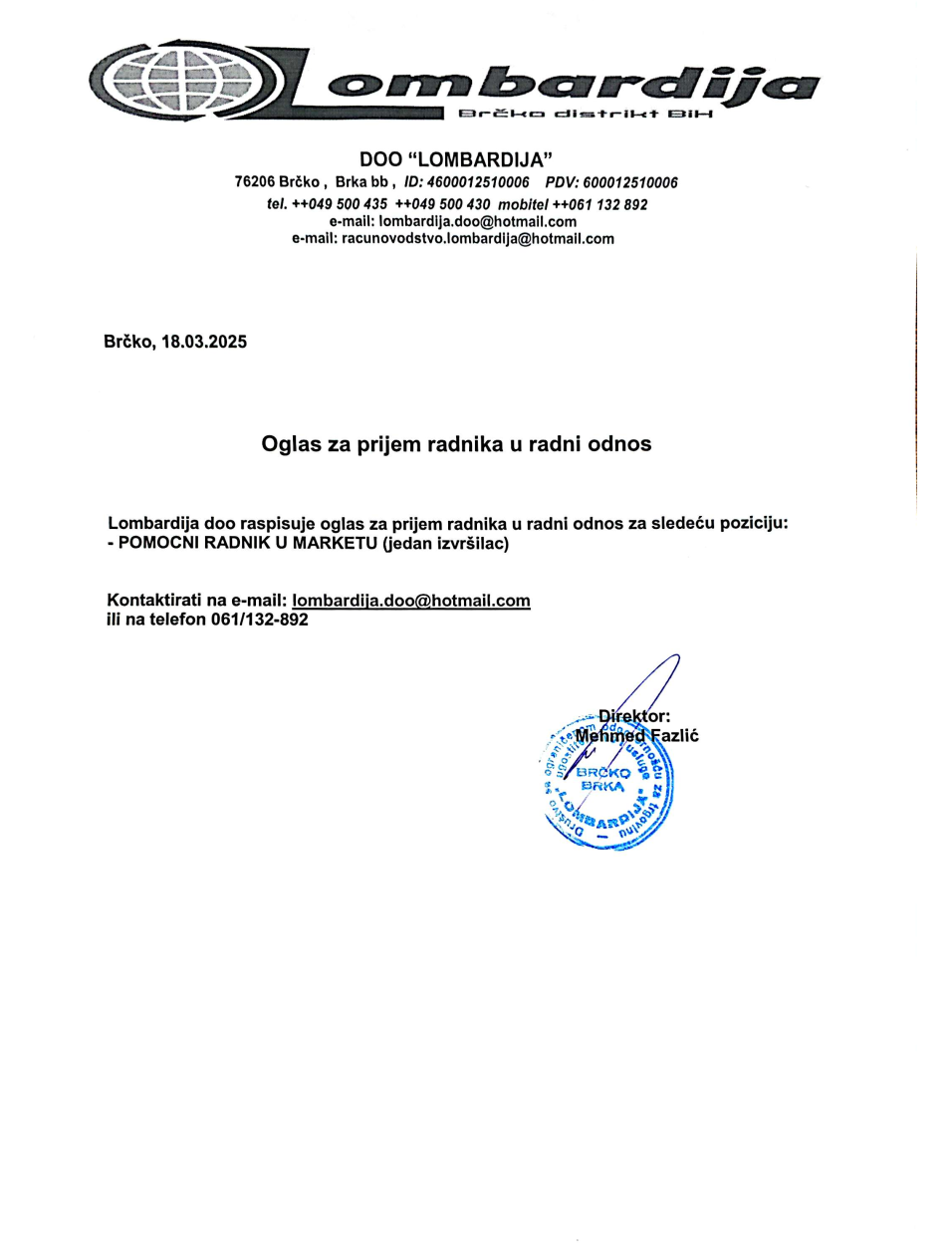 Poslovi 18 Mar,2025 Štampa Poslovi Pomoćni radnik u marketu Pomoćni radnik u marketu (1)Lombardija dooBrčko Prethodno Sljedeće