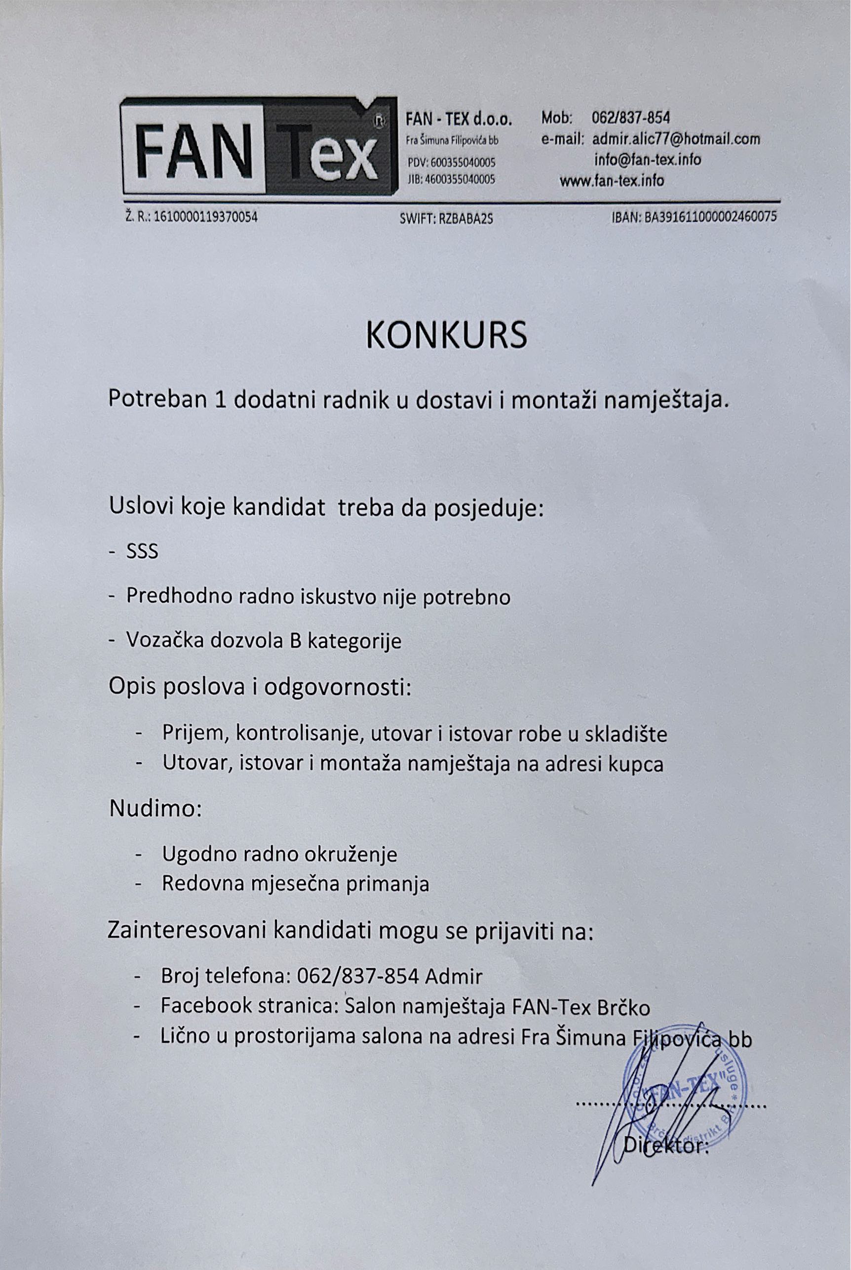Poslovi 11 Avg,2023 Štampa Poslovi Radnik na dostavi i montaži namještaja Radnik na dostavi i montaži namještaja (1)Fan-tex dooBrčko Prethodno Sljedeće
