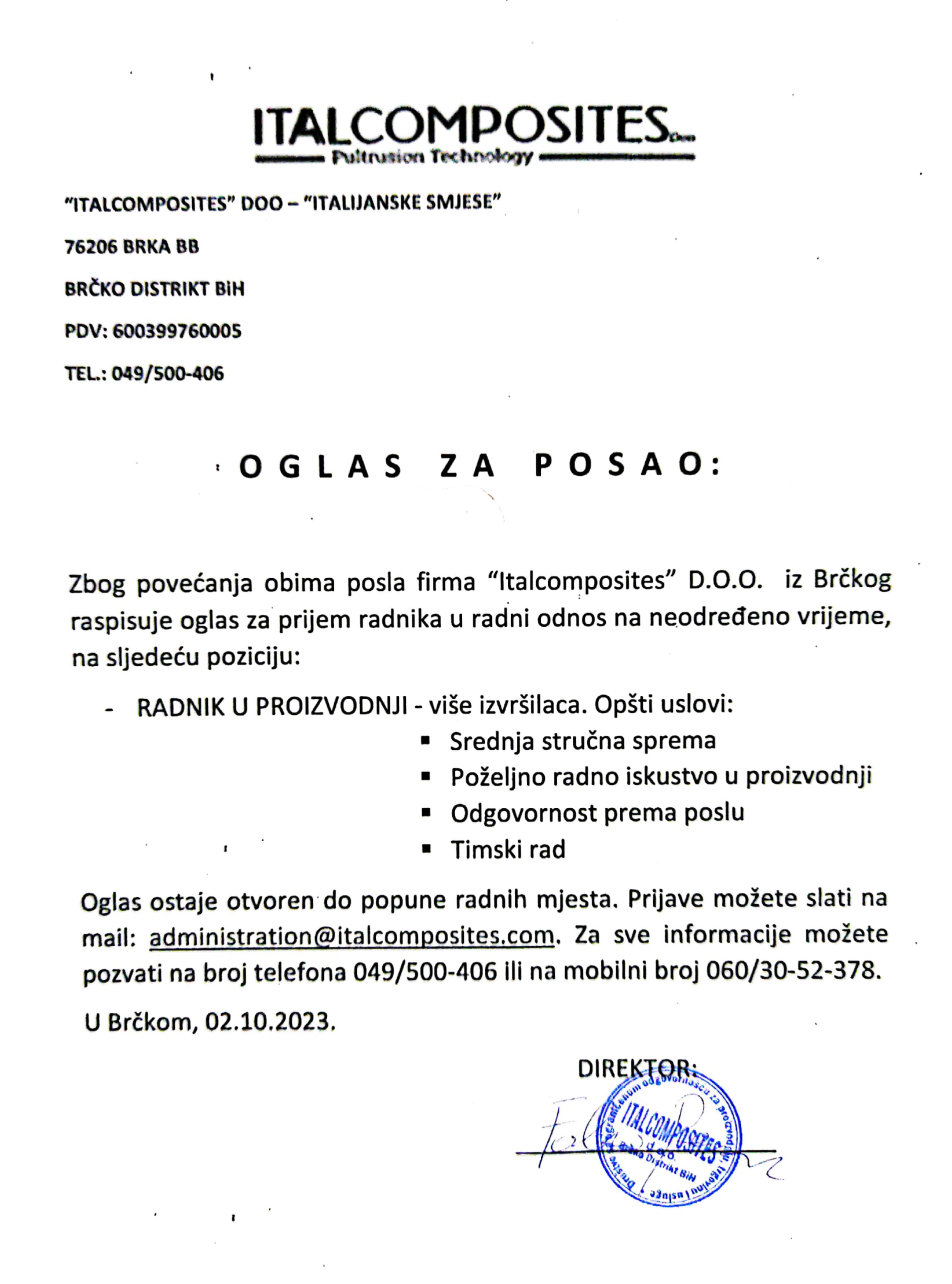 Poslovi 05 Okt,2023 Štampa Poslovi Radnik u proizvodnji Radnik u proizvodnji (više)Italcomposites dooBrka, Brčko Prethodno Sljedeće
