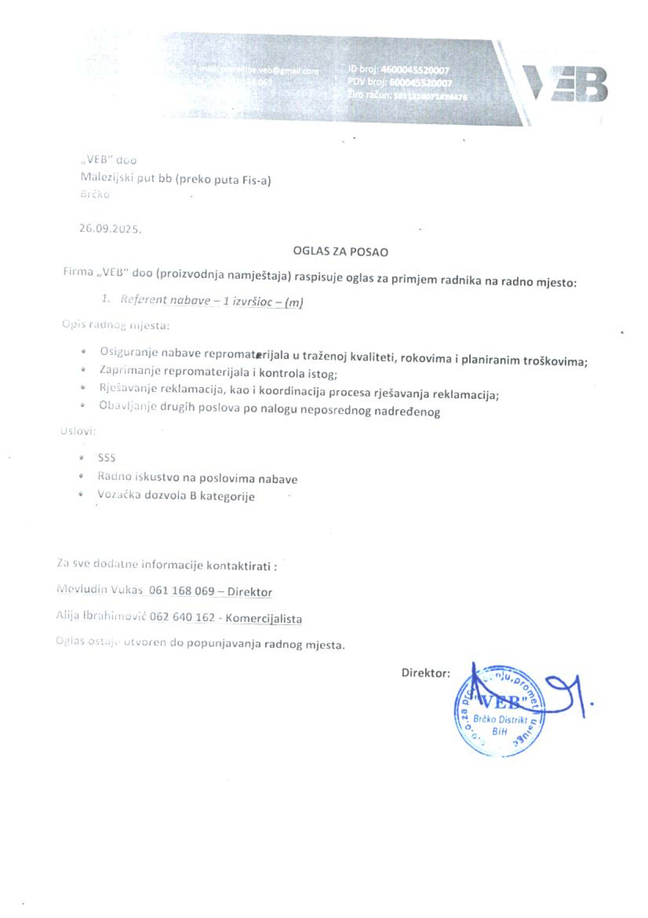 Poslovi 26 Sep,2025 Štampa Poslovi Referent nabave Referent nabave (1)"Veb sleep" d.o.o. Brčko Prethodno Sljedeće