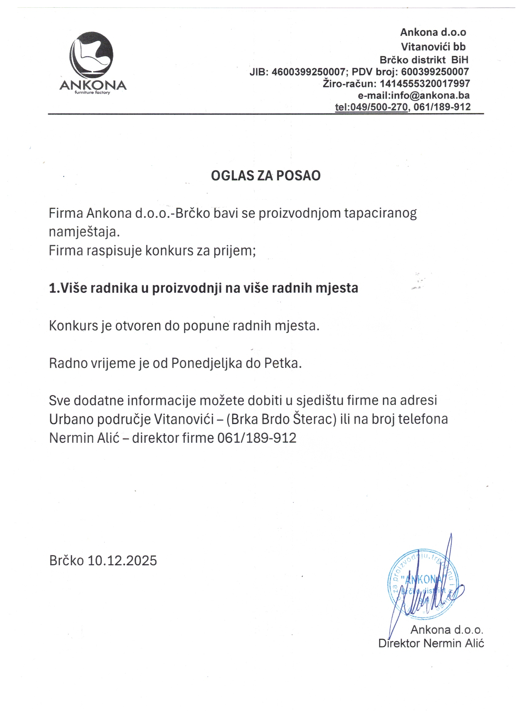 Poslovi 10 Dec,2025 Štampa Poslovi Više radnih mjesta Kliknite ovdje za oglas Više radnih mjesta"Ankona" d.o.o.Vitanovići, Brčko Prethodno Sljedeće