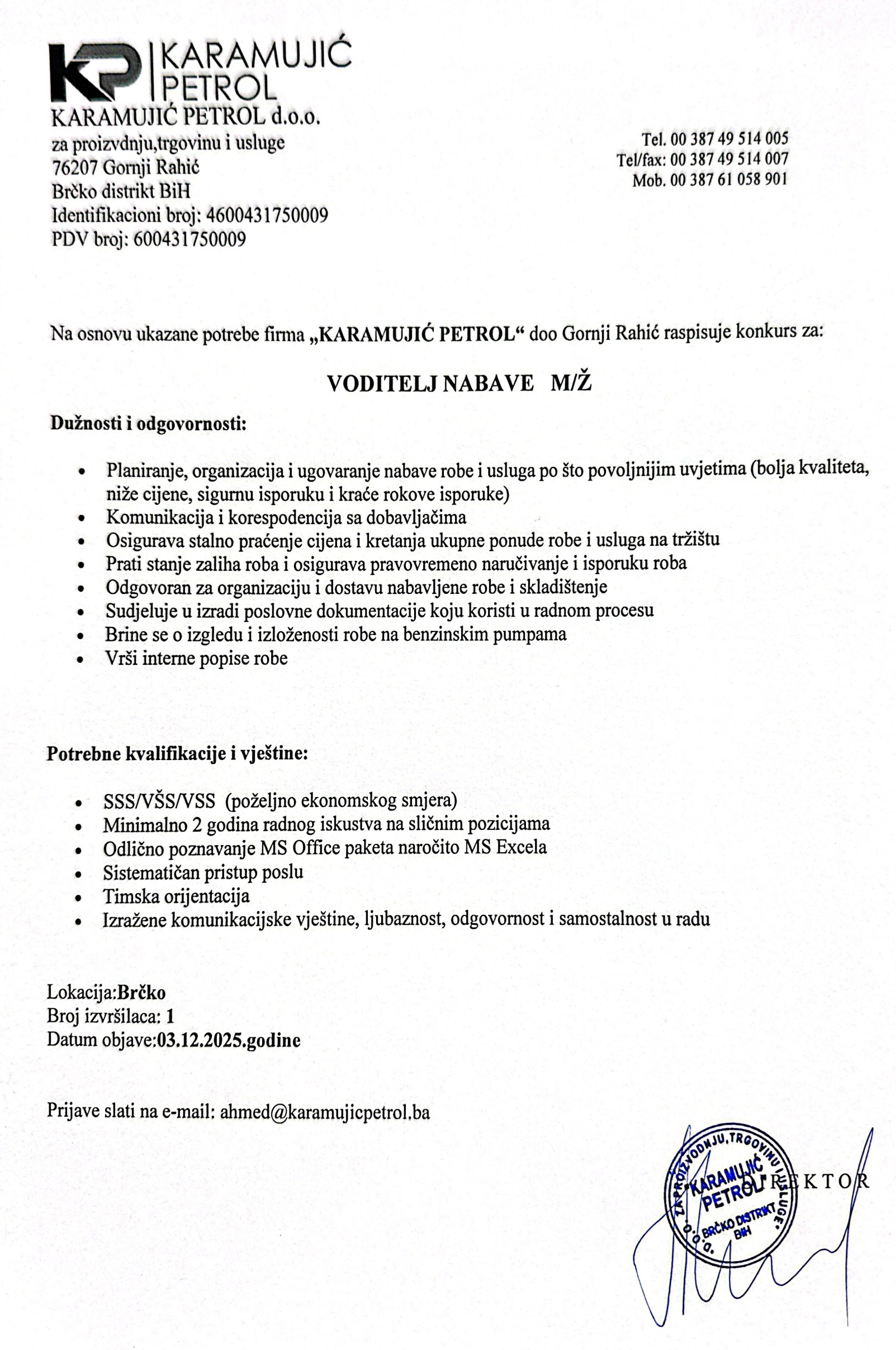 Poslovi 05 Dec,2025 Štampa Poslovi Voditelj nabave Voditelj nabave (1)"Karamujić petrol" d.o.oBrčko Prethodno Sljedeće