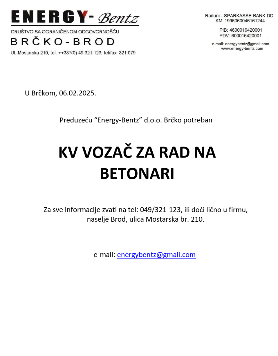 Poslovi 07 Feb,2025 Štampa Poslovi Vozač na betonari Vozač na betonari (1)Energy Bentz dooBrod Brčko Prethodno Sljedeće