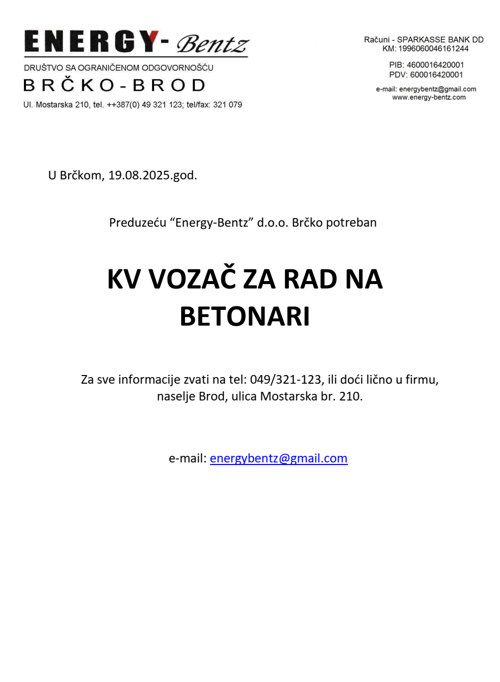 Poslovi 20 Avg,2025 Štampa Poslovi Vozač na betonari Vozač na betonari (1)Energy-Bentz dooBrčko, Brod Prethodno Sljedeće