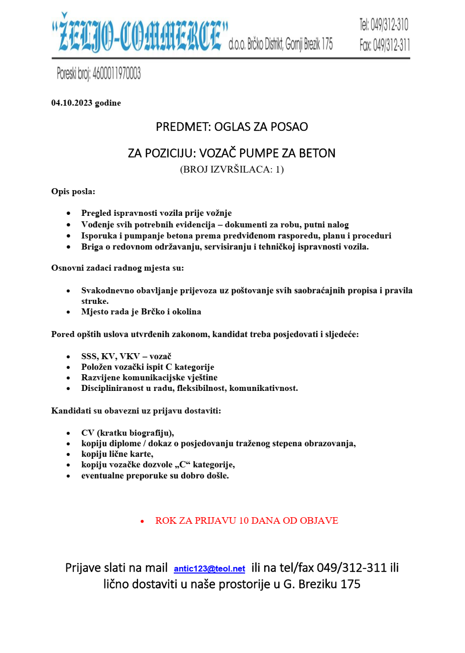 Poslovi 04 Okt,2023 Štampa Poslovi Vozač pumpe za beton Vozač pumpe za beton (1)Željo-commerce dooG Brezik, Brčko Prethodno Sljedeće