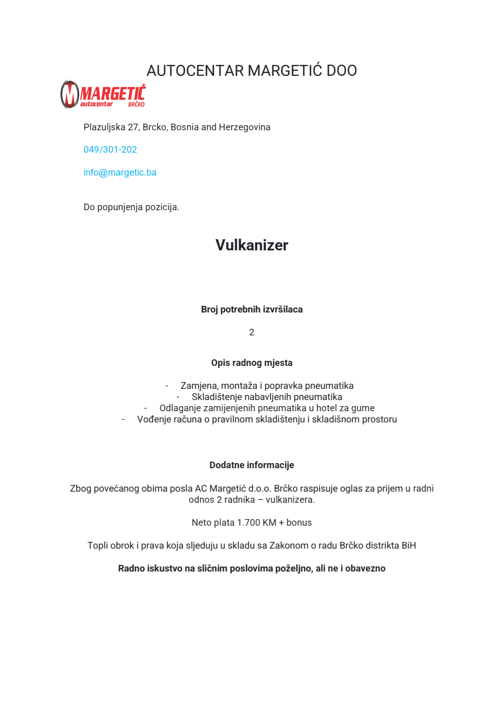 Poslovi 14 Jul,2025 Štampa Poslovi Vulkanizer Vulkanizer (1)AC Margetić d.o.o.Brčko Prethodno Sljedeće
