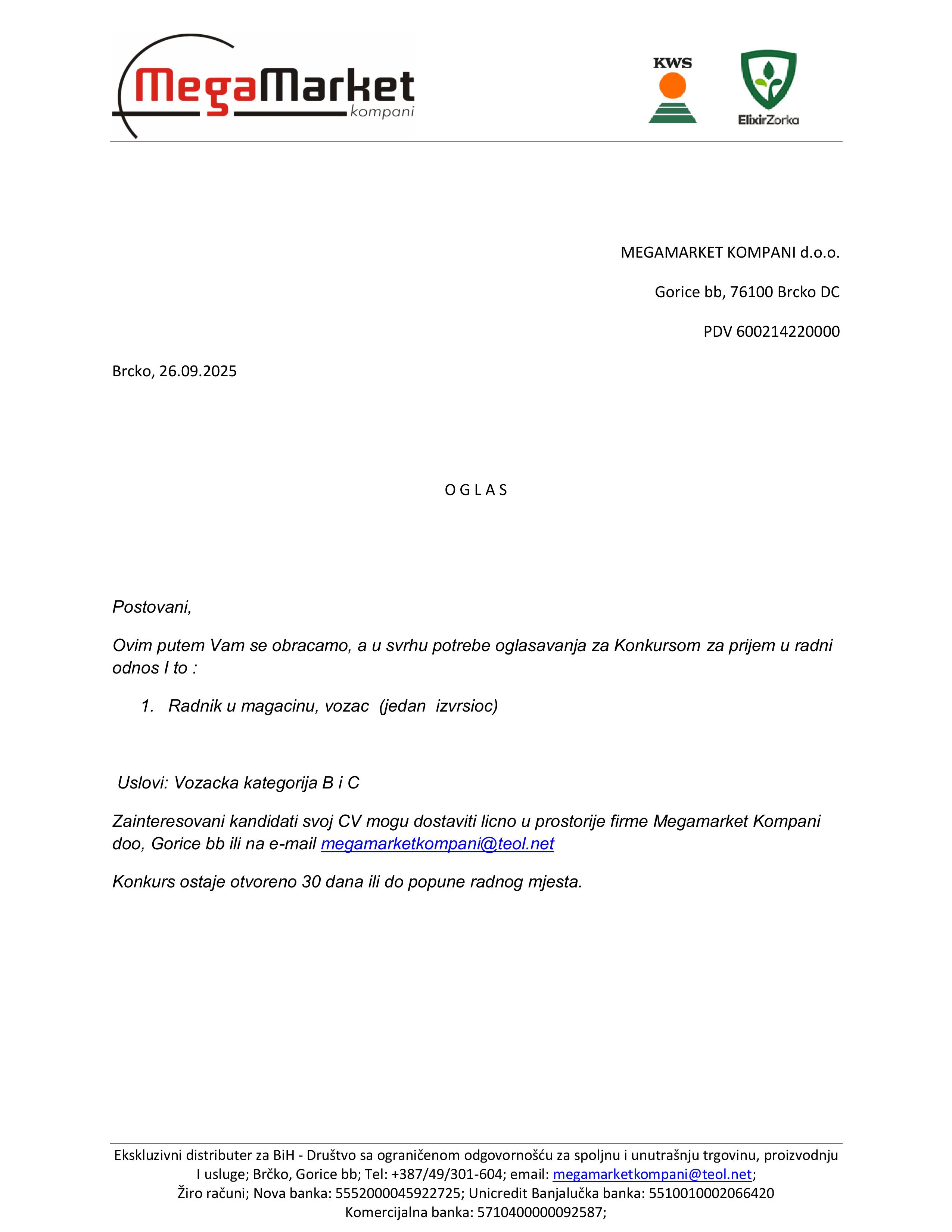 Poslovi 26 Sep,2025 Štampa Poslovi Radnik u magacinu, vozač Radnik u magacinu, vozač (1)"MegaMarket" d.o.o.Brčko Prethodno Sljedeće