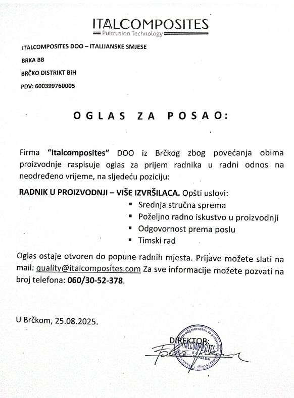 Poslovi 26 Avg,2025 Štampa Poslovi Radnik u proizvodnji Radnik u proizvodnji (više izvršilaca)Italcomposites d.o.o.Brka, Brčko Prethodno Sljedeće