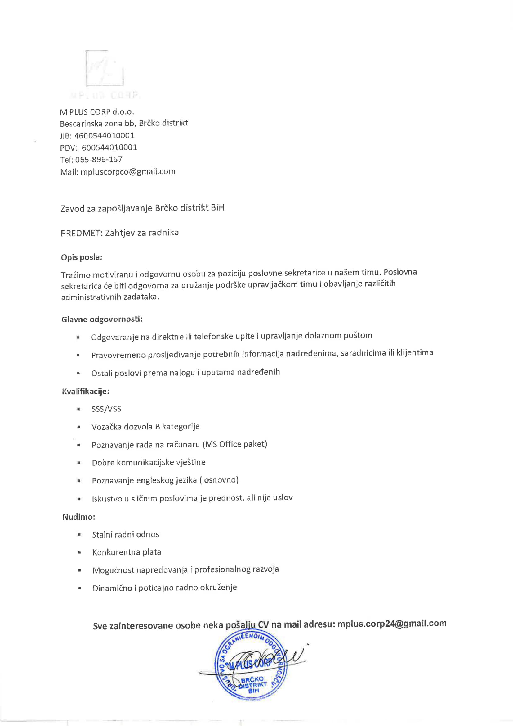 Poslovi 15 Sep,2025 Štampa Poslovi Sekretarica Sekretarica (1)"M Plus corp" d.o.o.Brčko Prethodno Sljedeće
