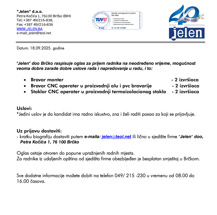 Poslovi 18 Sep,2025 Štampa Poslovi Više radnih mjesta Više radnih mjesta (6)"Jelen" d.o.o.Brčko Prethodno Sljedeće