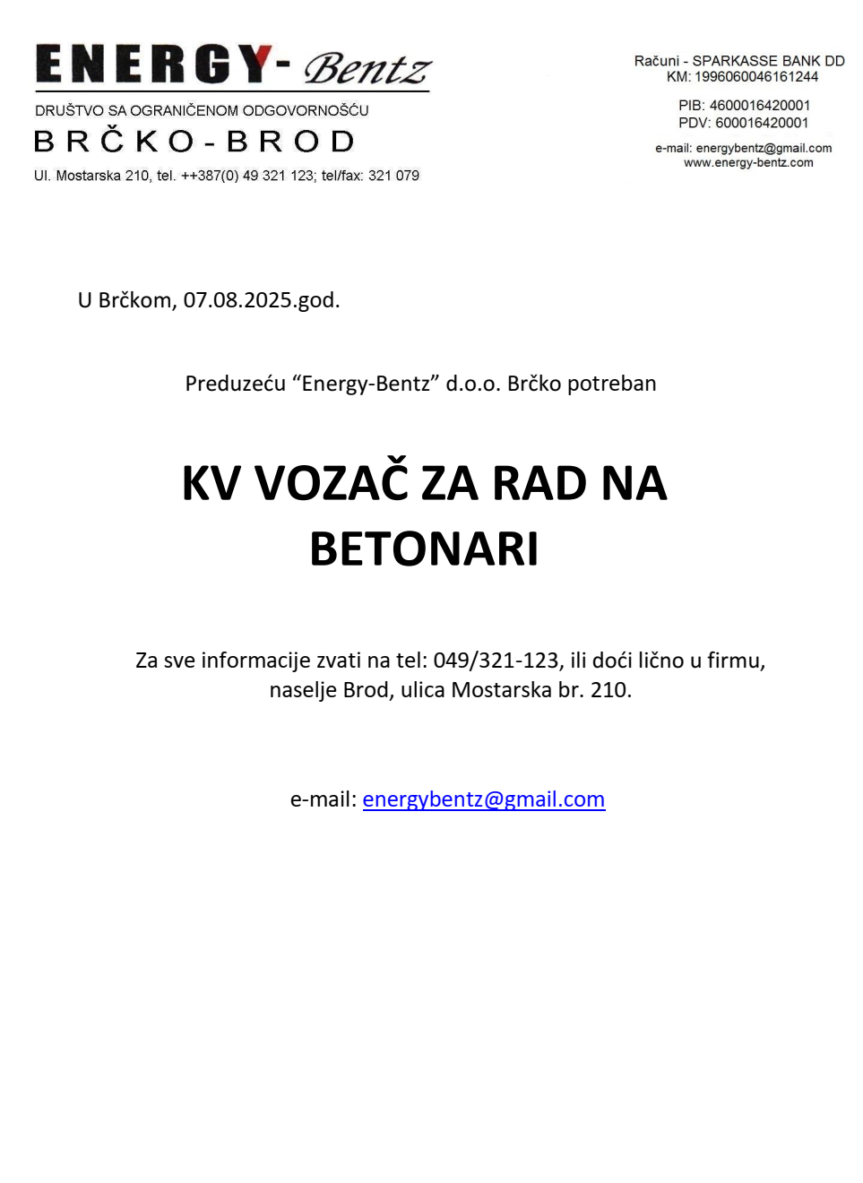 Poslovi 08 Avg,2025 Štampa Poslovi Vozač na betonari Vozač na betonari (1)Energy-Bentz dooBrod, Brčko Prethodno Sljedeće